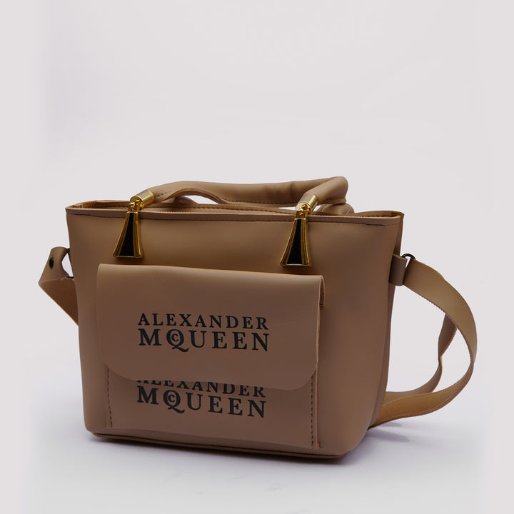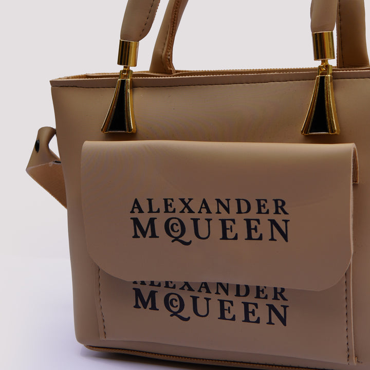Showcase your sophisticated taste with this Alexander McQueen inspired shoulder bag in a soft beige finish. Crafted from smooth faux leather with elegant gold-tone handle accents and dual "Alexander McQueen" branding, this bag combines everyday functionality with luxurious style. A must-have for fashion-forward individuals.