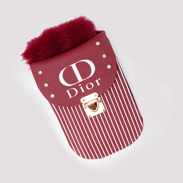 Elevate your accessory game with this burgundy mini sling bag featuring vertical white stripes and a bold faux fur trim. The flap is adorned with gold-tone studs and a prominent "Dior"-inspired logo for a luxury look. Perfect for nights out or when you want to make a style statement on the go.