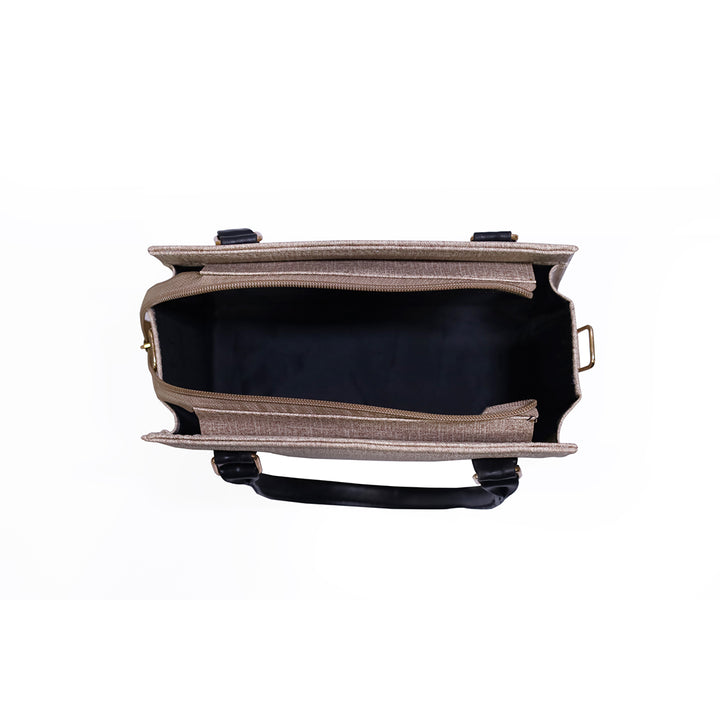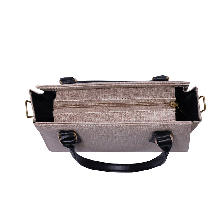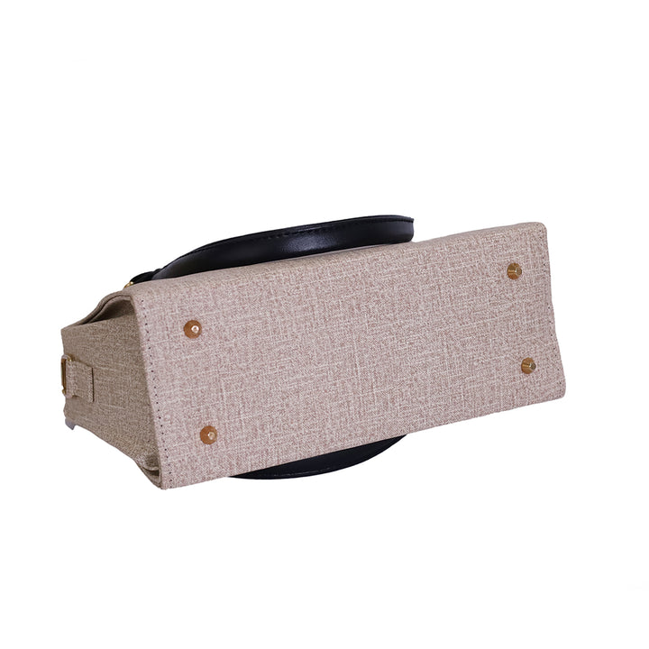 A timeless handbag designed to complement every outfit. This elegant beige structured handbag features a textured body with contrasting black handles and gold hardware, making it the perfect blend of sophistication and practicality. With a roomy interior and secure zip closure, it’s ideal for work, casual outings, or evening gatherings.